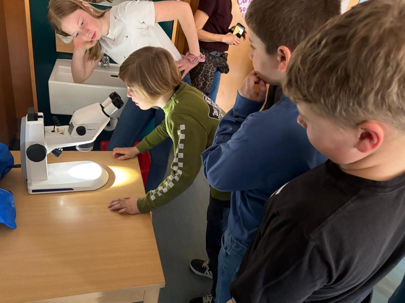 Im Physiksaal, durften wir verschiedene Versuche beobachten und auch selbst ausprobieren. Unter dem Mikroskop wurden Insekten unter die Lupe genommen und das englische Theater sorgte für viele Lacher.